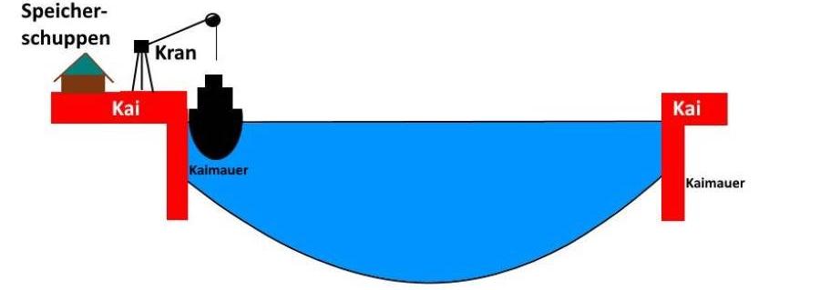 4 - In dem neuen Hamburger Hafenbecken, das man Sandtorhafen nannte, wurden zunächst ein Kai und eine Kaimauer errichtet. An dieser Kaimauer legten die Schiffe längsseits an. Kräne, die mit Dampfmaschinen betrieben wurden, hievten die Güter aus den Laderäumen und setzten sie direkt auf dem Kai ab, von wo aus sie in nahe gelegene Speicherschuppen gebracht werden konnten. Oder man setzte sie gleich auf Pferdefuhrwerke oder Eisenbahnwaggon ab und transportierte sie damit weiter.
