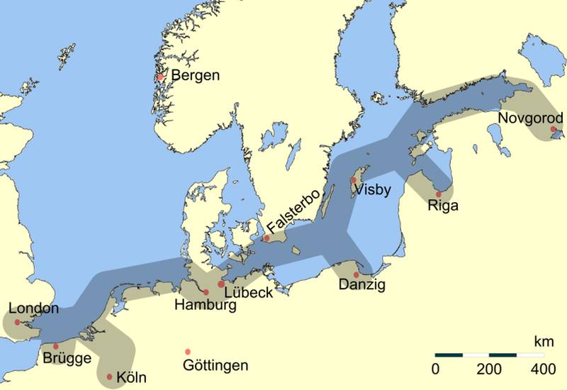 3 - Zwischen 1250 und 1400 lag die Blütezeit der Hanse. Im gesamten Ostseeraum, aber auch im Binnenland hatte sie ihre Niederlassungen, die man Kontore nannte. Die wichtigsten Hansestädte an der Ostsee waren Lübeck, Danzig, Visby und Riga. Bedeutende Hansestädte an der deutschen Ostseeküste waren außerdem Wismar, Stralsund und Greifswald. Die Hansestadt Nowgorod in Russland war ebenfalls per Schiff erreichbar. Sie war wichtig für den Handel mit Russland.