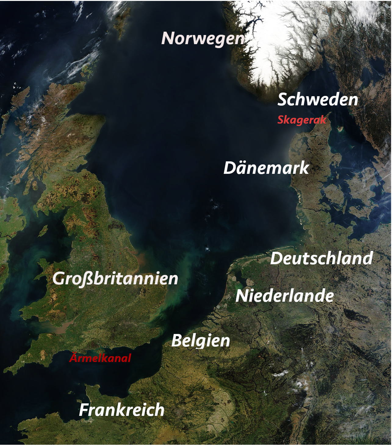 Dieses Meer im Norden Deutschlands ist ein Teil des großen Atlantischen Ozeans. An die Nordsee grenzen die Länder Großbritannien, Norwegen, Schweden, Dänemark, Deutschland, die Niederlande, Belgien und Frankreich. Das Seegebiet Skagarak verbindet die Nordsee mit der Ostsee, der Ärmelkanal die südliche Nordsee mit dem Atlantik.