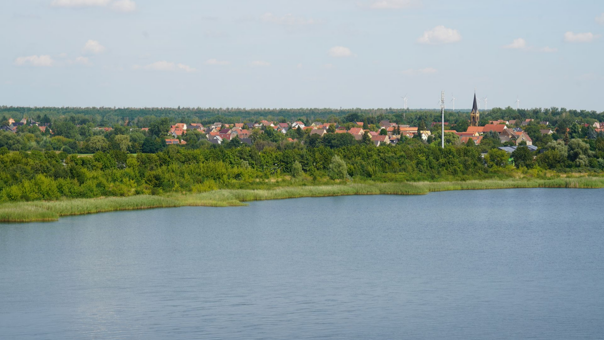 Der Große Goitzschesee und die Stadt Pouch im Hintergrund