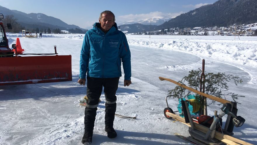 6 - Norbert Jank ist ein besonderer Eismeister, weil er auf einem natürlichen See arbeitet. Eismeister arbeiten sonst meistens in Eissporthallen und bearbeiten künstliche Eisflächen. Er hat sich alles selbst beigebracht. Seit über 50 Jahren arbeitet er schon auf dem Weissensee. Anfangs hat er Besucher mit Pferdeschlitten über das Eis gefahren.