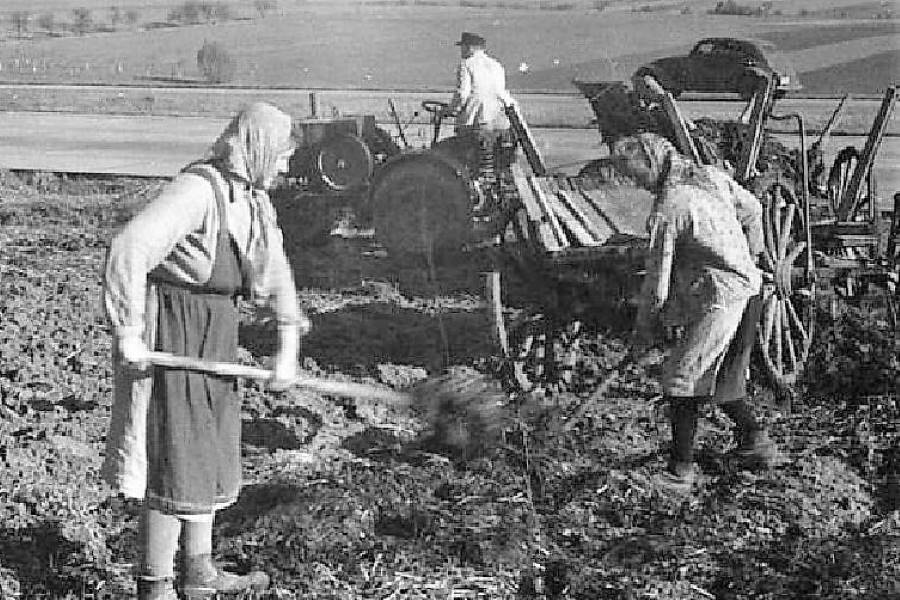 Als Oma klein war, gab es Kartoffelroder. Sie wurden von Pferden oder von einem Traktor gezogen. Mit dem Aufsammeln der Kartoffeln verdiente sich Oma Taschengeld.