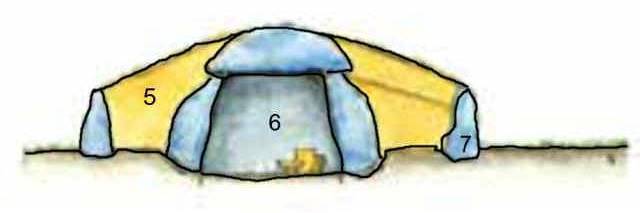 Schließlich bedeckte man die Grabkammer mit Erde (5). Das Innere der Kammer wurde wieder freigelegt (6). Manchmal umgab man die Anlage auch noch mit einer Reihe von Randsteinen (7).