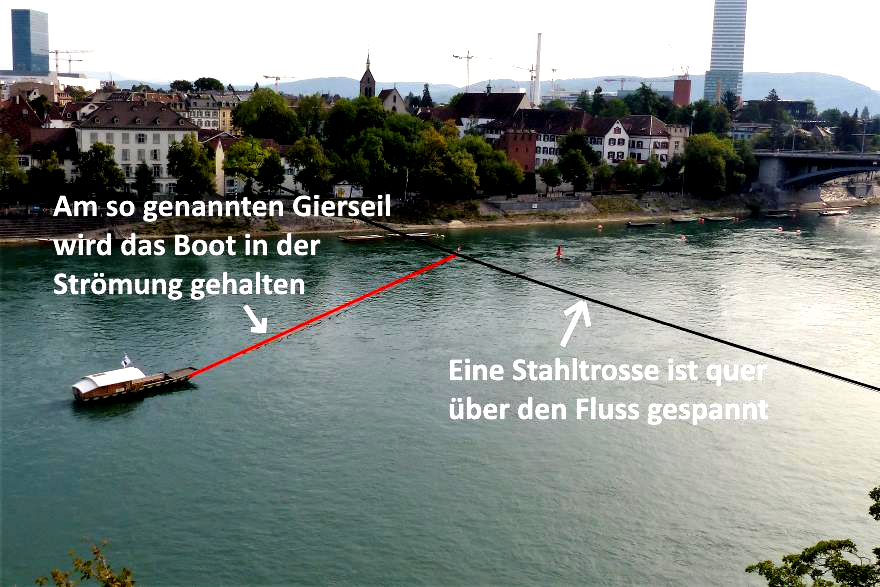 8 - So braucht man weder Ruder noch Motoren. Die Strömung allein reicht aus, um die Boote hin und her fahren zu lassen. Wer's nicht glaubt, kann ja mal nach Basel fahren und es ausprobieren.